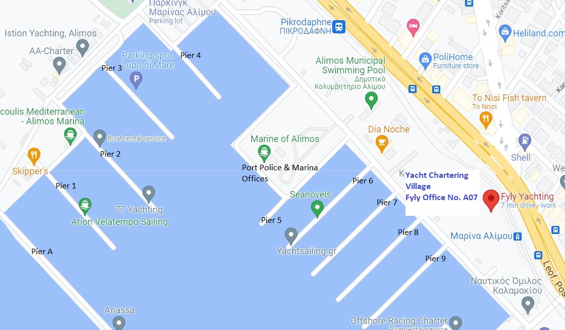 The Marina is located southwest of Athens, 15 km from the city center, 8 km south of Piraeus port and 30 km from the Eleftherios Venizelos International Airport. It is served by a dense transportation network of trams, buses, taxis with a stop just 200 meters from the Marina. In January 2021, development projects began with aim to enrich and utilize the marina with additional projects and upgrade it to one of the most modern marinas in the Mediterranean. During the development works, Alimos Marina remains in full operation. Alimos Marina is the largest marina in Greece with 1,064 berths, while there is a dry-docking area for about 600 boats. It can accommodate yachts up to 40 meters long. The maximum depth of the marina is 6.5 meters.